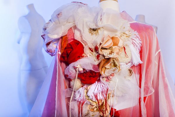 In my piece, I needed a lot of fabric, but due to lockdown, I was struggling to obtain the fabric. So I took apart vintage undergarments for the Kimono which I had, to get scraps of the fabric. Then I created some flowers with those scraps. For the belt, I needed quite a long, continuous piece of fabric which is about 4m. Luckily, I kept a roll of vintage linen fabric for an undergarment for the Kimono as I was planning to tailor an undergarment in the future. I had to be brave to use it for making an Obi instead of the undergarment. But I’m happy now that it makes up a part of my piece!