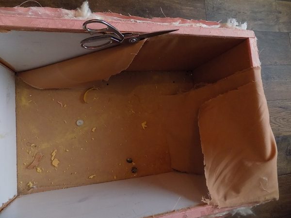 Old furniture is usually very well crafted with layers of foam padding, wadding and fabric. I celebrate materials eroded over time, such as the foam padding on the seat (lid) of the storage chest. Erosion of the surface creates texture and is a great material to be molded and easily cut.